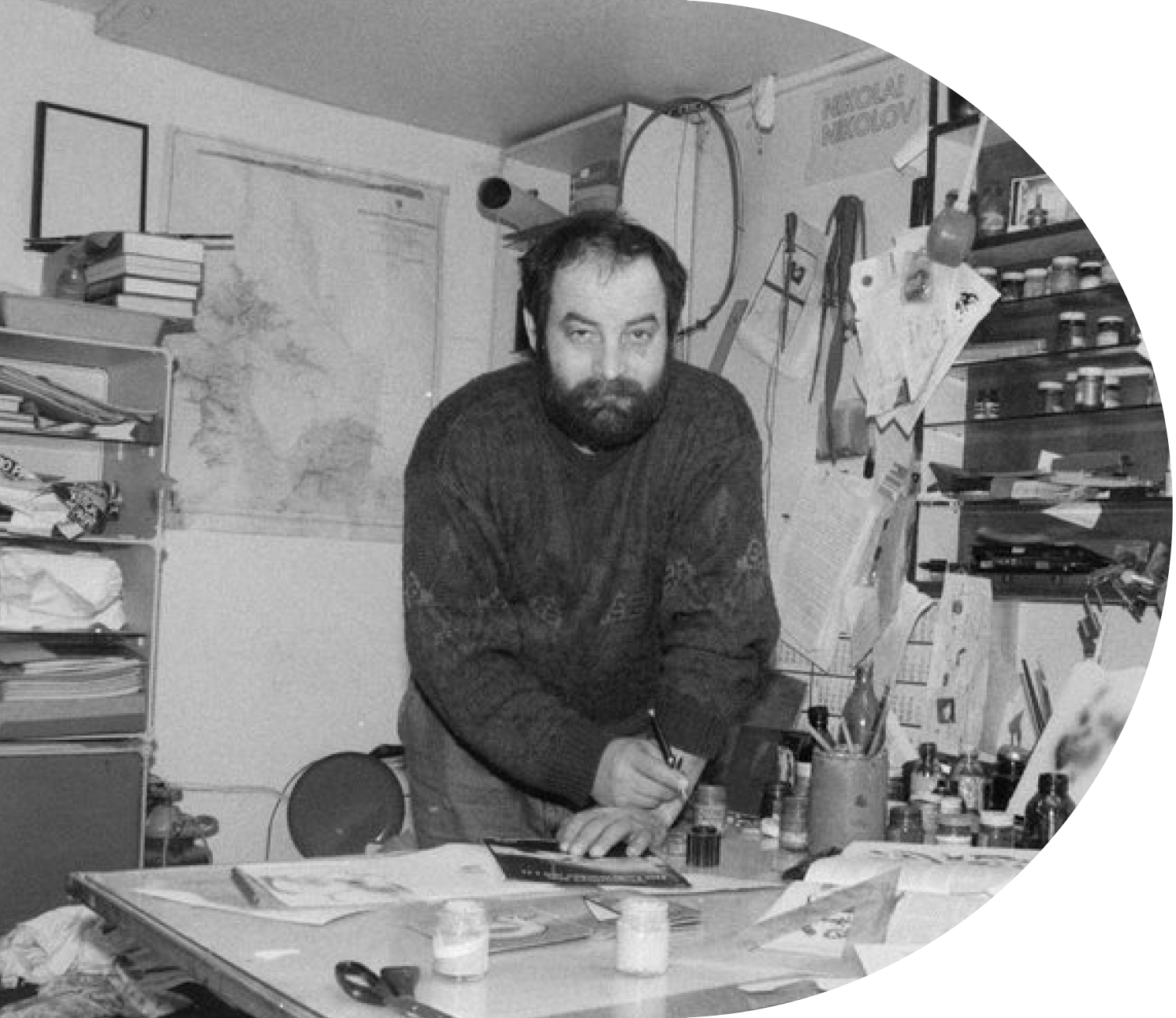Precise and rationally structured images constitute the centrepiece of fascinating compositions. This kind of distinct constructivism is linked to a philosophic symbolism that reflects on phenomena of the human condition such as clashes of hierarchies, power and dominance, as well as relationships, loneliness and beyond. The pictorial space becomes liberated and open whereas the graphic forms are crystal clear in manifestation and sharp, bright and definitive in execution. Notwithstanding, distant analogies can be found with the purity, symbolism and figurative power of Japanese graphics. In fact, with his distinct stylistic approach and plastic expression Nikolay Nikolov not only stands out, but he has no analogue in the Bulgarian graphics art.More than that, Nikolov was able to apply this adopted artistic manner of work in the creation of some magnificent drawings in tempera, watercolour and ink. They are rich in colour intensity and succeed in conveying spontaneous feeling with free painterly manner. Indeed, the artist often combines geometric shapes with natural plant elements thus achieving a particular conceptual symbiosis between the natural living environment and the world of abstraction.Post-2000, Nikolov made some large-format drawings (2x3m) using oil pastels. The artist’s visual language becomes freer and more expressive, clearly abandoning the previous strict geometrical form of composition and expression. In these works, as the sonorous colour joins in with the strong emotional impulse, it allows the emergence of the abstract-expressionist spirit. These traits become further embedded in Nikolov’s digital works, which are noteworthy with their distinct picturesque harmonies, and to them he has devoted much attention and energy. In his art, this exceptional artist has always demonstrated his strong inclination towards innovative, contemporary expression. Erudite and inquisitive, Nikolay Nikolov was a restless and searching personality that carried an intellectual revolt against the conservative and conventional forms of art. And it is Nikolov’s remarkable artistic talent that places him high in the creative hierarchy of contemporary Bulgarian art.